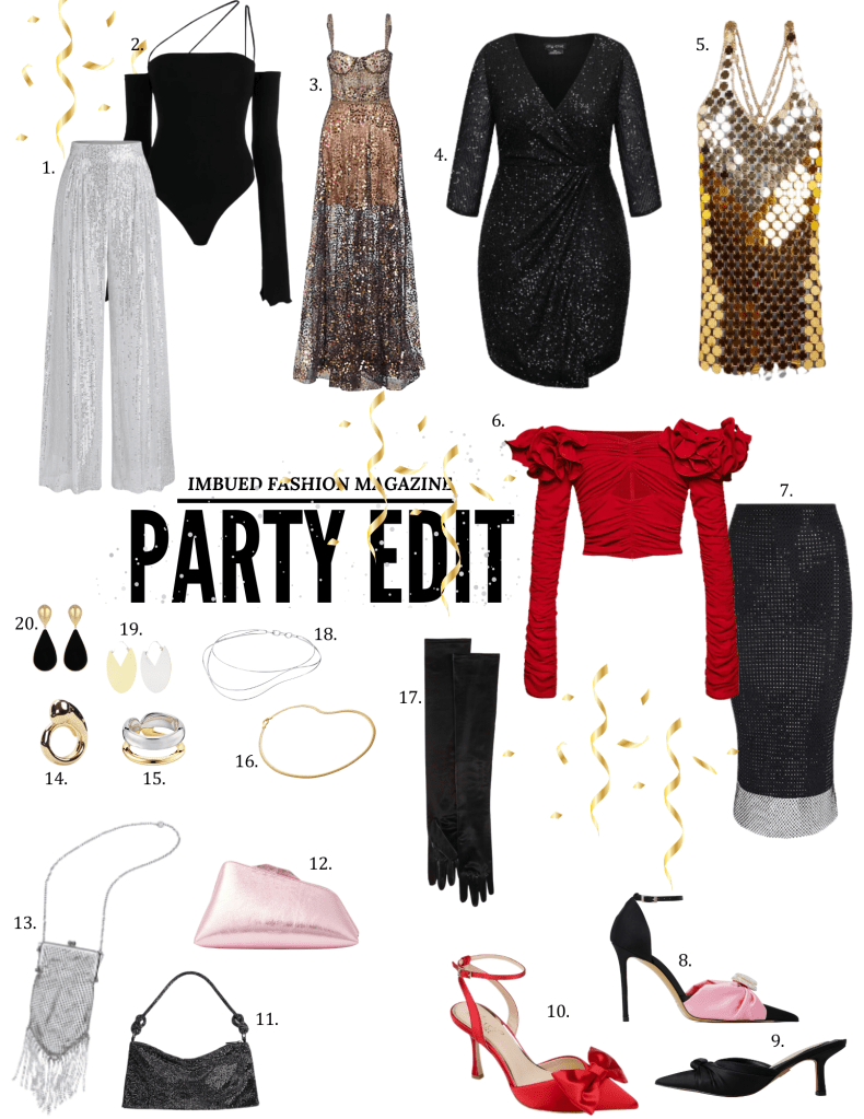 1. Sequin straight leg trousers Cider, $36; shopcider.com 2. Off the shoulder bodysuit Andamane, $240; farfetch.com 3. Midnight Noir Gown Bronx and Banco,$1,100; revolve.com 4. Razzle dress City Chic, $139; citychic.com 5. Ombre mirrored disc mini Karen Miller, $290; karenmiller.com 6. Floral off the shoulder rusched top Luxe Dress, $125; luxedress.com 7. High waisted mesh skirt Express, $158; express.com 8. Double heart heels Mach Mach, $925; ssense.com 9. Point toe mule Express, $68; express.com 10. Satin stiletto bow Badgley Mischka, $129; badgleymischka.com 11. Rhinestone knot bag Express, $138; express.com 12. Metallic clutch Attico, $676; mytheresa.com 13. Metal mesh handbag H&M, $259; hm.com 14.Karina ring Cult Gia, $148; cultgia.com 15. Duet mixed ring Mejuri, $98; mejuri.com 16. Snake chain necklace Monica Vinader, $175; monicavinder.com 17. Long gloves H&M, $35; hm.com 18. Wave necklace Elsa Peretti, $2600; tifanny.com 19. 90° two tone earrings Isabel Marant, $545; farfetch.com 20. Hourglass earrings Saint Laurent, $1290; ysl.com