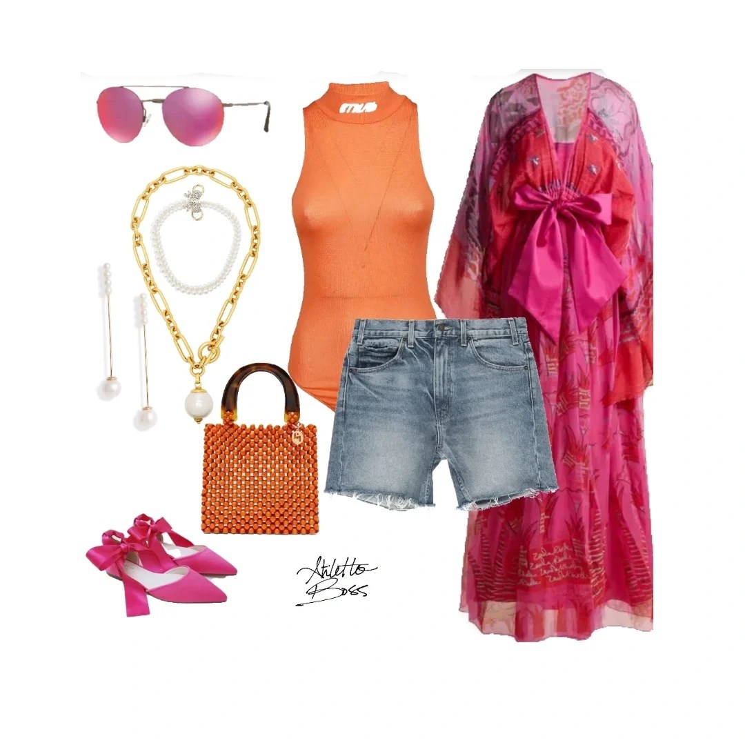 Make a statement in an orange ribbed tank, denim shorts, and a vivid pink kimono. Add an orange beaded bag and colorful sunglasses to turn heads from the first note till the last.