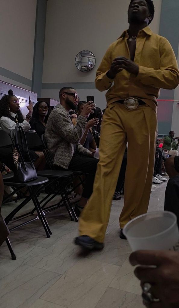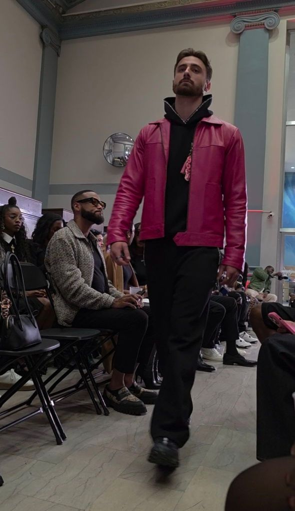From the front row, I took in every moment: mustard yellow suede two-pieces, sequin sets that shimmered under the lights, scarves tied at the waist, and the signature GRÉVYI socks peeking out from footwear. Leather, of course, made its statement: bold, structured, and effortlessly cool. Even the staff looks stood out; those GRÉVYI button-downs were lowkey one of my favorite looks of the night.